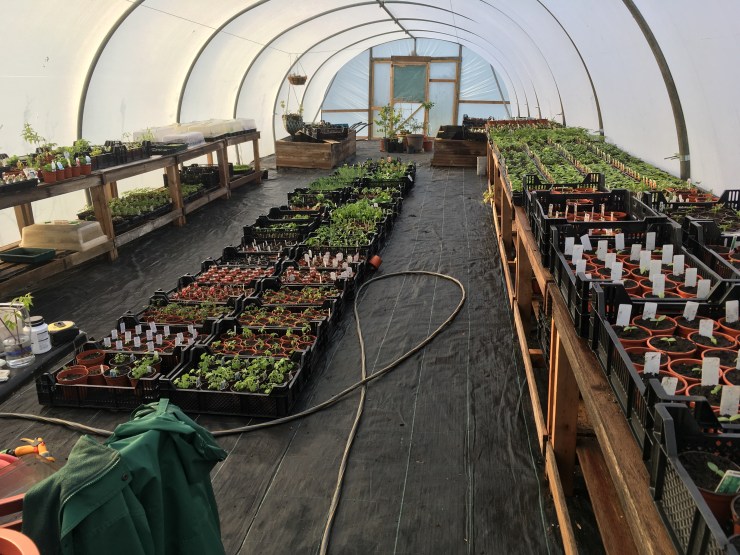 Seedlings that were started indoors under lights were transferred to the polytunnel throughout early spring