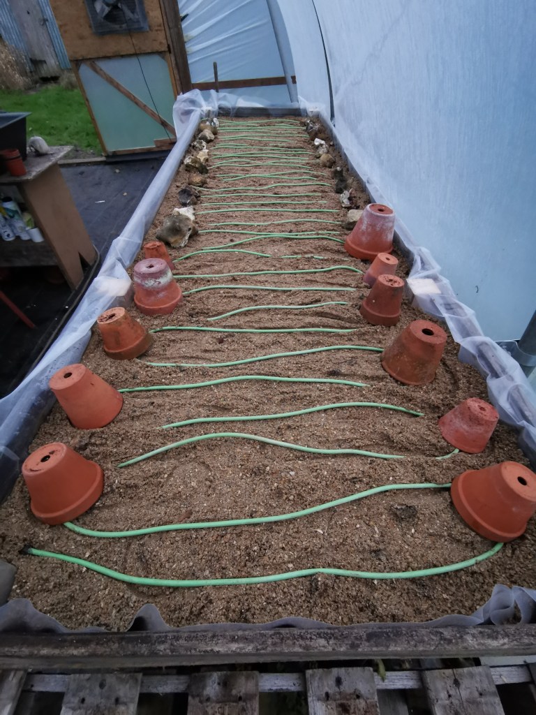 We were able to recycle this cable which we found buried in a corner of the old greenhouse, once used for a small ‘cuttings’ bed. It was warped and almost solid after being piled up underground for over 12 years, so we warmed it up and used some pots to hold it down for a little while until it became bendy again. The cable is layed as close as possible without touching, to give the best results.