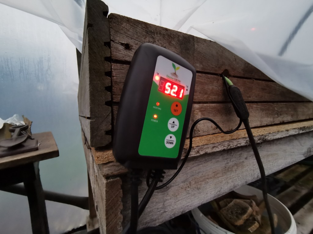 This thermometer also displays humidity which is great for sprouting seeds. We use basic plastic propagation lids over the top to help create a nice humid environment inside.