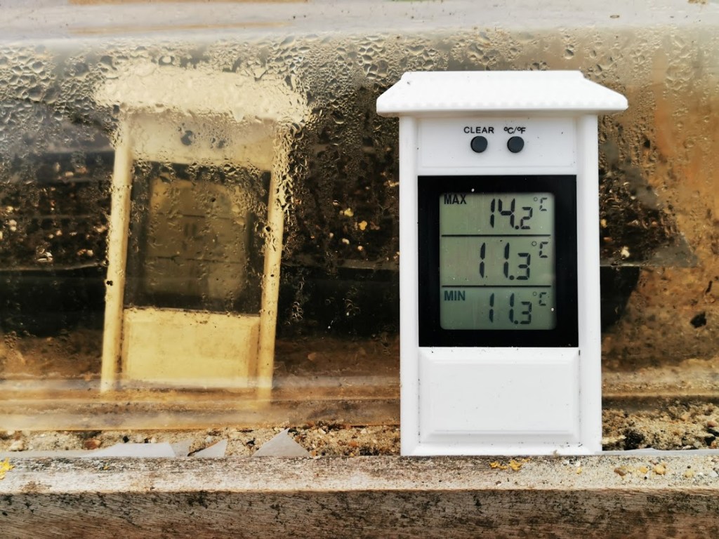 We are using simple waterproof thermometers to record the minimum and maximum temperatures on the seed bed as well as other areas inside the polytunnel and one outside for comparison. This will show what temperature the bed has dipped to overnight as when propagating seedlings we need to keep our bed at least 10c to avoid any damage to our tender seedlings!