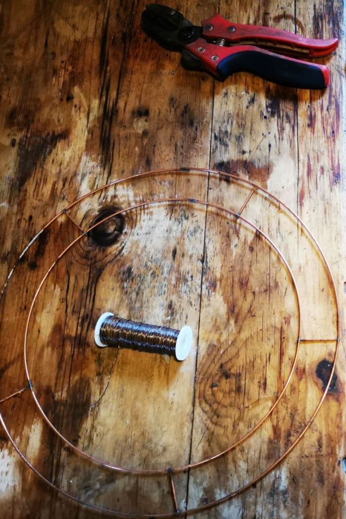 Materials and tools used to create a strong and sturdy base include a metal wreath ring, floristry wire and secateurs/wire cutters.