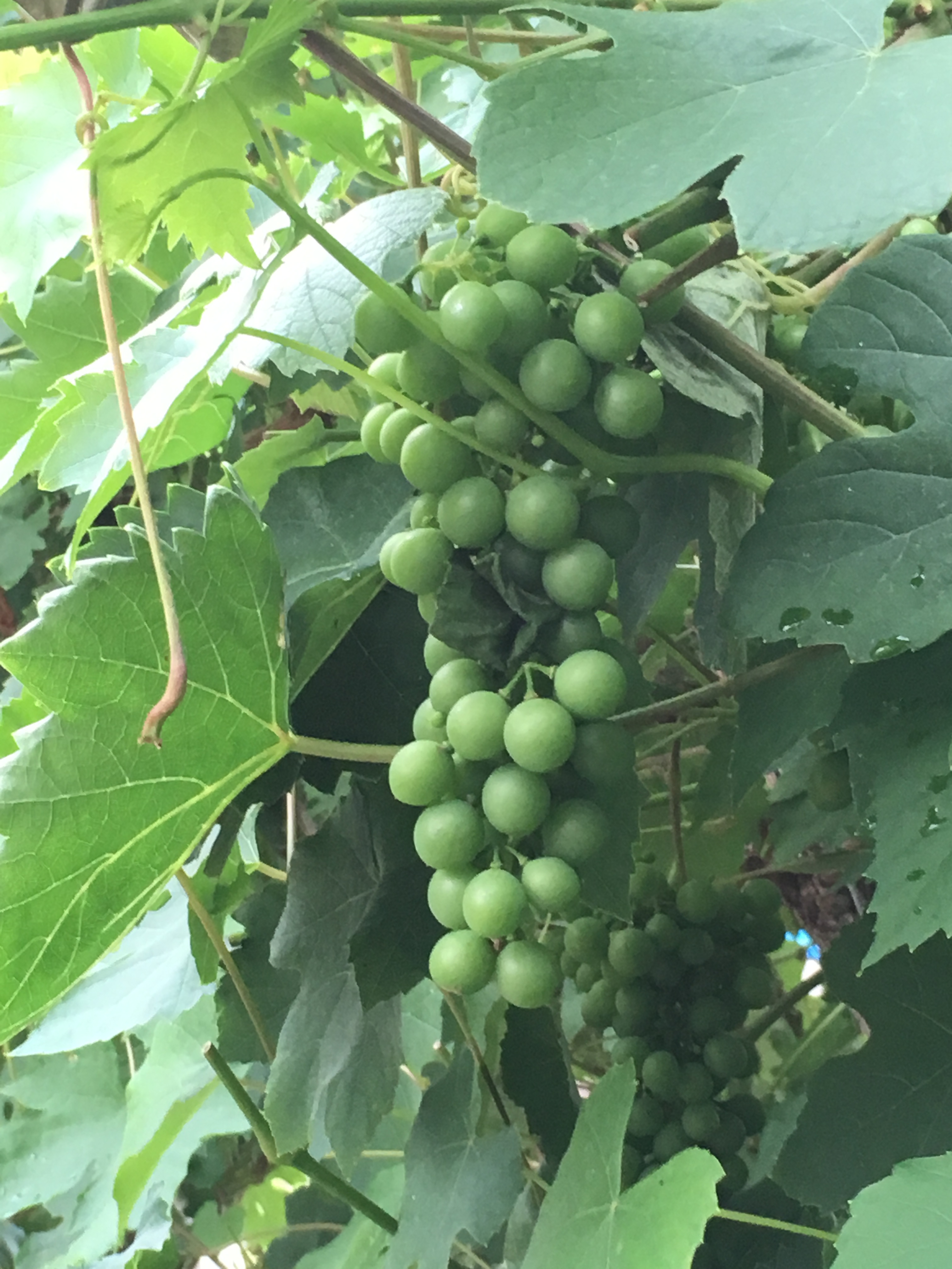 The white grapevine has been growing for many years and produces big bunches every summer!